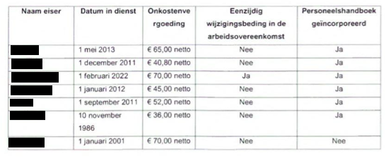 De werknemers ontvangen sinds hun indiensttreding een vaste onkostenvergoeding netto per maand die altijd al aanzienlijk hoger is dan de gemaakte onkosten. Dit is algemeen bekend en de werkgever heeft dit al die tijd gedoogd. De werknemers zien en gebruiken het als loon, evenals de ondernemingsraad. Tijdens salarisonderhandelingen is de vaste maandelijkse onkostenvergoeding door werkgever benoemd en ingezet om tegemoet te komen aan hogere salariswensen. De onkostenvergoeding is met het salaris uitbetaald en wordt in de arbeidsovereenkomst vermeld onder het kopje salaris. Het is tijdens ziekte en vakanties doorbetaald. Bovendien is de onkostenvergoeding in promotiebrieven vermeld als salariscomponent.